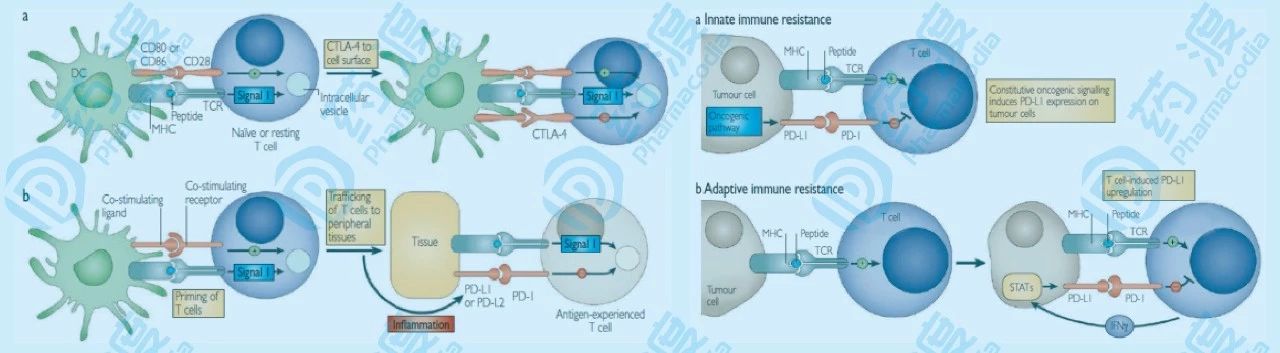 圖1 :免疫負(fù)調(diào)控示意圖 (a)當(dāng)T細(xì)胞對(duì)抗原產(chǎn)生初次響應(yīng)時(shí),CTLA-4介導(dǎo)的免疫檢查點(diǎn)被誘導(dǎo)激活。這種由CTLA-4介導(dǎo)的誘導(dǎo)激活程度,依賴(lài)于起始T細(xì)胞受體調(diào)整的信號(hào)強(qiáng)度。高親和配體能夠誘導(dǎo)表達(dá)更多的CTLA-4,從而減弱了起始響應(yīng)的強(qiáng)度。當(dāng)T細(xì)胞受體遭遇抗原后,誘導(dǎo)下游通路,CTLA-4被轉(zhuǎn)運(yùn)到細(xì)胞表面,此時(shí)CTLA-4起到信號(hào)減弱的功能,以維持一個(gè)恒定的T細(xì)胞激活水平。(b)與CTLA-4不同,PD-1信號(hào)通路并不在起始T細(xì)胞激活階段起作用,而是在外周組織中,效應(yīng)T細(xì)胞識(shí)別組織中的抗原,以調(diào)節(jié)炎癥響應(yīng)的過(guò)程中。這些組織中的炎癥信號(hào)(IFN-γ,主要由I型輔助T細(xì)胞表達(dá))能夠誘導(dǎo)組織細(xì)胞中的PD-L1的表達(dá),從而抑制效應(yīng)T細(xì)胞對(duì)其免疫響應(yīng)。在慢性抗原暴露的情況下,T細(xì)胞表面過(guò)量誘導(dǎo)的PD-1,可以引發(fā)T細(xì)胞的活性耗竭。(c)在腫瘤細(xì)胞中,PD-L1的表達(dá)或不依賴(lài)于腫瘤微環(huán)境中的炎癥信號(hào),AKT、STAT3信號(hào)通路的激活可誘導(dǎo)表達(dá)PD-L1,或依賴(lài)于炎癥信號(hào),表達(dá)下游的免疫檢查點(diǎn)抑制蛋白。