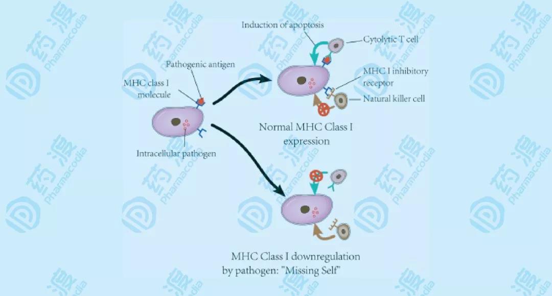 圖2 NK細(xì)胞的“丟失自我”的殺傷機(jī)制 NK細(xì)胞通過(guò)自身表面的激活型和抑制型受體,調(diào)節(jié)自身的細(xì)胞毒性,比如殺傷細(xì)胞類(lèi)免疫球蛋白受體。大部分受體不僅表達(dá)在NK細(xì)胞上,也表達(dá)在T細(xì)胞上。抑制型受體識(shí)別并結(jié)合MHC-I,這樣也可以解釋NK細(xì)胞殺傷那些沒(méi)有表達(dá)MHC-I的細(xì)胞。而MHC-I在抗原呈遞過(guò)程中,激活細(xì)胞毒性T細(xì)胞。但是,當(dāng)被感染或變異的細(xì)胞,逐漸降低表達(dá)MHC-I,使它們自身免于被T細(xì)胞發(fā)現(xiàn),規(guī)避T細(xì)胞免疫。而NK細(xì)胞正好彌補(bǔ)了這一點(diǎn)。