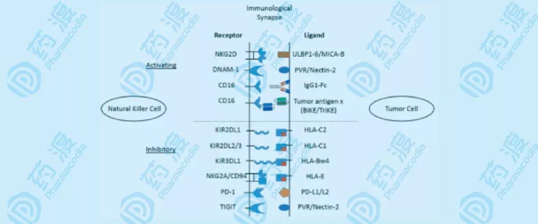 盡管NK細(xì)胞并不需要腫瘤相關(guān)抗原識(shí)別,來(lái)調(diào)整抗腫瘤的響應(yīng),但NK細(xì)胞同樣存在免疫檢查點(diǎn)的激活或抑制機(jī)制。雖然目前在細(xì)胞因子治療方法,以及NK細(xì)胞過(guò)繼轉(zhuǎn)移等方面有所進(jìn)步,但是,腫瘤細(xì)胞表達(dá)的針對(duì)NK細(xì)胞免疫檢查點(diǎn)的配體,仍然能夠抑制NK細(xì)胞介導(dǎo)的腫瘤細(xì)胞裂解。于是NK細(xì)胞功能缺失,腫瘤逃逸,病情加劇。因此目前有一些新的藥物被研發(fā)出來(lái),針對(duì)腫瘤-NK細(xì)胞的抑制型免疫檢查點(diǎn),以限制這種抑制作用。