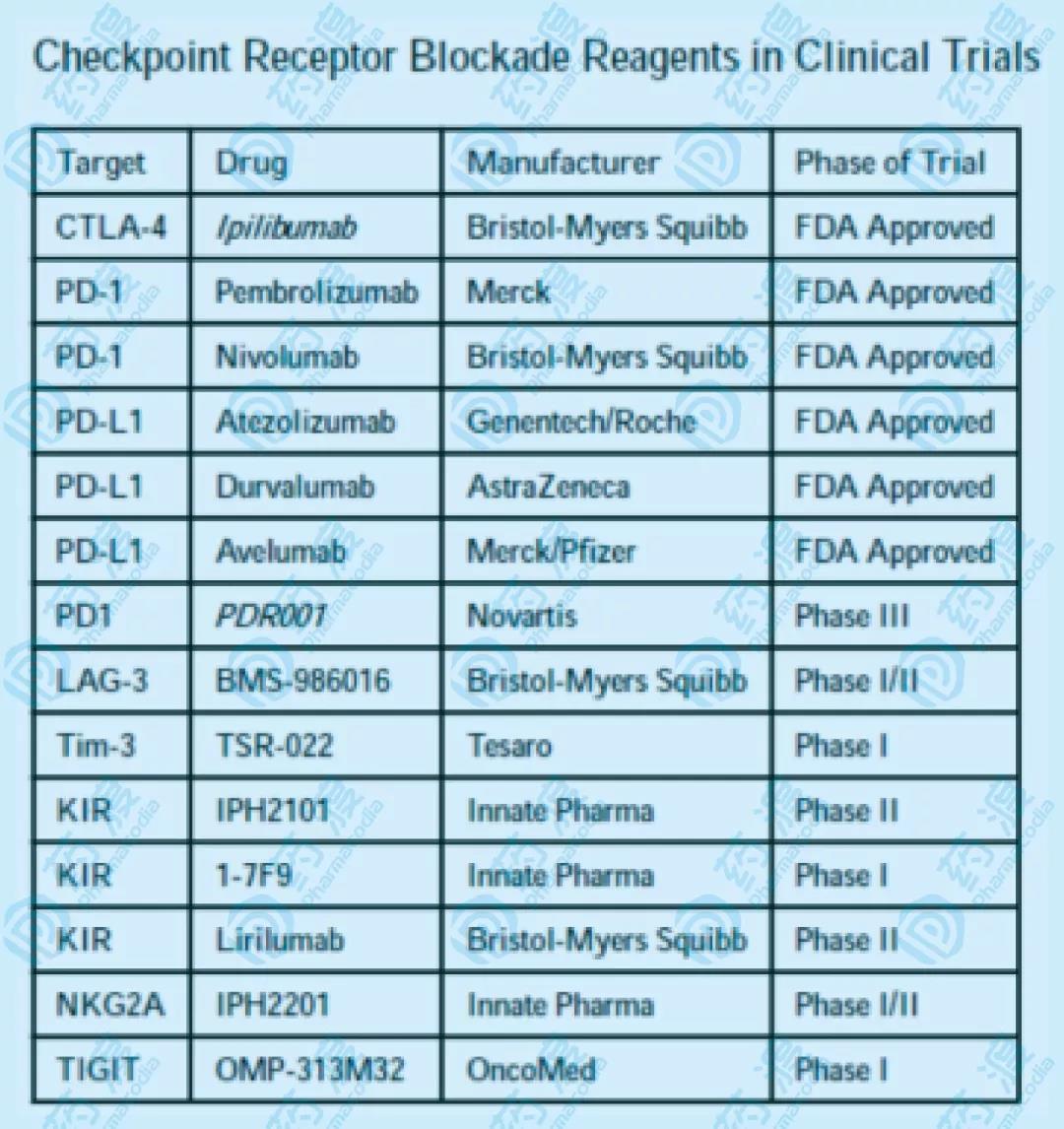 KIR抗體,IPH2101,在針對(duì)那些完全緩解狀態(tài)的急性髓細(xì)胞樣白血病患者的I期臨床研究中,顯示KIR結(jié)合發(fā)生在90%以上的NK細(xì)胞中(2周,最小劑量1mg/kg體重)。KIR抗體的治療也升高了TNF-α和MIP-1β的血清濃度,以及NK細(xì)胞早期的激活標(biāo)簽CD69。在多發(fā)性骨髓瘤的治療中,KIR抗體也產(chǎn)生了類(lèi)似的效果。然而,在關(guān)于郁積性多發(fā)性骨髓瘤(MM)的II期臨床中,并沒(méi)有顯著療效。這可能與IPH2101介導(dǎo)的KIR2D受體的胞啃作用有關(guān),即通過(guò)KIR抗體的ADCC作用,KIR2D受體被“啃掉”并轉(zhuǎn)移到其他免疫細(xì)胞。盡管KIR抗體有效地阻斷了KIR2D的信號(hào)通路,但是也阻斷了這些表達(dá)KIR2D的NK細(xì)胞被“教育”(結(jié)合MHC-I)的能力,最終可能導(dǎo)致NK細(xì)胞對(duì)MM細(xì)胞的響應(yīng)清零。這個(gè)難題也揭示了,在復(fù)雜的生物系統(tǒng)中,靶向檢查點(diǎn)抑制研發(fā)所存在的一些挑戰(zhàn)。