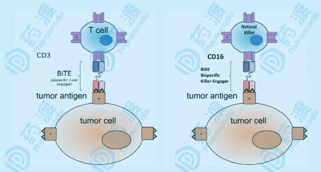 圖6 BiTE和BiKE BiTE能夠同時(shí)結(jié)合T細(xì)胞和腫瘤細(xì)胞,具有兩條scFv串聯(lián)結(jié)構(gòu)的抗體,分別結(jié)合T細(xì)胞的CD3ε(TCR亞基)和腫瘤細(xì)胞的腫瘤相關(guān)抗原。而B(niǎo)iKE則能夠同時(shí)結(jié)合NK細(xì)胞和腫瘤細(xì)胞,結(jié)構(gòu)與BiTE相近,結(jié)合NK細(xì)胞的CD16a,強(qiáng)化ADCC作用,以及腫瘤相關(guān)抗原。新一代的BiTE甚至加入了抗PD-1/PD-L1的scFv,以減少免疫檢查點(diǎn)抑制。類(lèi)似的原理(圖3),BiKE可以融合IL-15或拮抗前述受體信號(hào)通路的scFv(TriKE),移除免疫抑制或增強(qiáng)免疫響應(yīng)。
