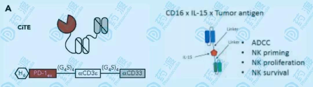 激活NK細(xì)胞、解除NK細(xì)胞的免疫抑制、限制NK細(xì)胞毒性的時(shí)空。 新的針對(duì)NK細(xì)胞的研究,比如仿照BiTE思路而來(lái)的BiKE(圖6),以及仿照CAR-T思路的CAR-NK(另文描述)。BiTE加上抗PD-1的部分成為了CiTE(檢查點(diǎn)抑制T細(xì)胞連接抗體),那么BiKE加上了IL-15的部分而成為了TriKE(三功能NK細(xì)胞連接抗體,圖7,8):