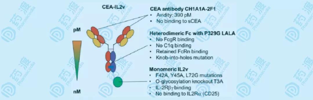 圖10 RG7813示意圖 抗CEA單抗特異性結(jié)合CEA最靠近細(xì)胞膜表面的結(jié)構(gòu)域,而不結(jié)合因酶切作用而進(jìn)入血液的可溶性部分,sCEA屬于腫瘤細(xì)胞抑制體液免疫的作用。IL-2通過(guò)突變改造,偏向于結(jié)合IL-2中等親和力受體IL-2Rβγ,從而激活NK細(xì)胞或CD8+細(xì)胞毒性T細(xì)胞。因?yàn)镮L-2存在,F(xiàn)c的ADCC/CDC的活性被取消,為了長(zhǎng)效作用仍保持FcRn的結(jié)合,并且因?yàn)閱蝹?cè)結(jié)合IL-2,引入KiH技術(shù)實(shí)現(xiàn)Fc的異二聚化。 設(shè)計(jì)理想中的抗體-細(xì)胞因子融合蛋白,包括以下步驟: 選擇合適的靶向抗原:在正常組織中表達(dá)量極低的腫瘤相關(guān)抗原,以減少抗體“沉沒(méi)”在正常組織中而無(wú)法發(fā)揮藥效,同時(shí)也需要腫瘤組織中盡可能高表達(dá),以便富集足夠多的細(xì)胞因子。細(xì)胞表面的抗原,結(jié)合后不會(huì)被細(xì)胞吸收,這樣可以延長(zhǎng)融合細(xì)胞因子的半衰期。腫瘤微環(huán)境相關(guān)抗原也可以,比如與腫瘤遷移、浸潤(rùn)相關(guān)的細(xì)胞因子。在血液循環(huán)中沒(méi)有顯著的數(shù)量,比如sCEA,能夠持續(xù)性消耗激活的免疫細(xì)胞,使這些免疫細(xì)胞無(wú)法造成有效殺傷。