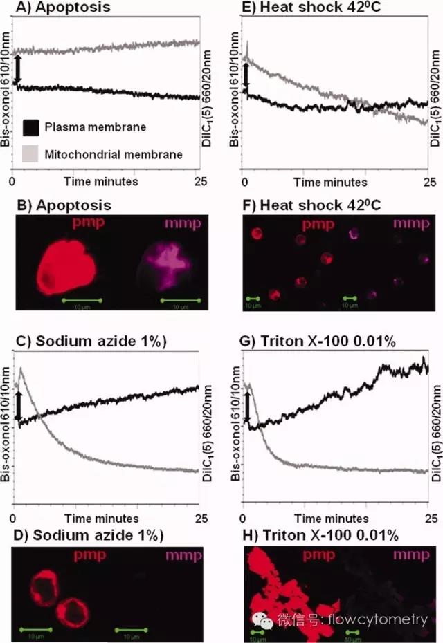 脹亡可能很多FLOWER都不太檢測,其實流式可以測,利用Annexin V FITC和DAPI排除掉凋亡細胞和壞死細胞,然后用DiIC1(5) 和 (DiBAC4(5))檢測線粒體膜電位和漿膜電位,實時觀察細胞在25分鐘內發生的變化(如下圖),很清楚地看出疊氮鈉、Triton等引起的脹亡與凋亡、熱休克等不同之處,就是線粒體膜電位快速下降而漿膜電位輕微增高。簡單吧!