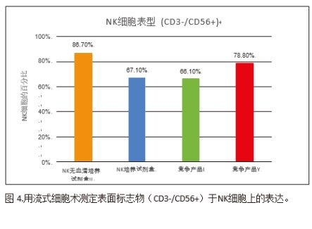 NK細胞的特異表面標(biāo)志物為CD3-/CD56+。流式細胞的分析結(jié)果 顯示使用NK無血清培養(yǎng)試劑盒II可獲得86.7%的NK陽性細胞,而使用競爭產(chǎn)品I和競爭產(chǎn)品Y的培養(yǎng)試劑盒則獲得相對較少的NK 陽性細胞(分別為66.1%和78.8%),數(shù)據(jù)如圖4所示。