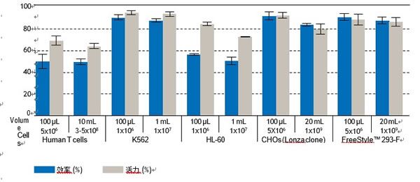 從小體積到大體積的拓展性 各種代表性的細(xì)胞類型,在相同條件下轉(zhuǎn)化同一種pmaxGFP載體質(zhì)粒,小體積(100 μL Nucleocuvette™轉(zhuǎn)染杯)與大體積(1mL或LV Nucleocuvette™ 電轉(zhuǎn)盒)的轉(zhuǎn)染情況比較。